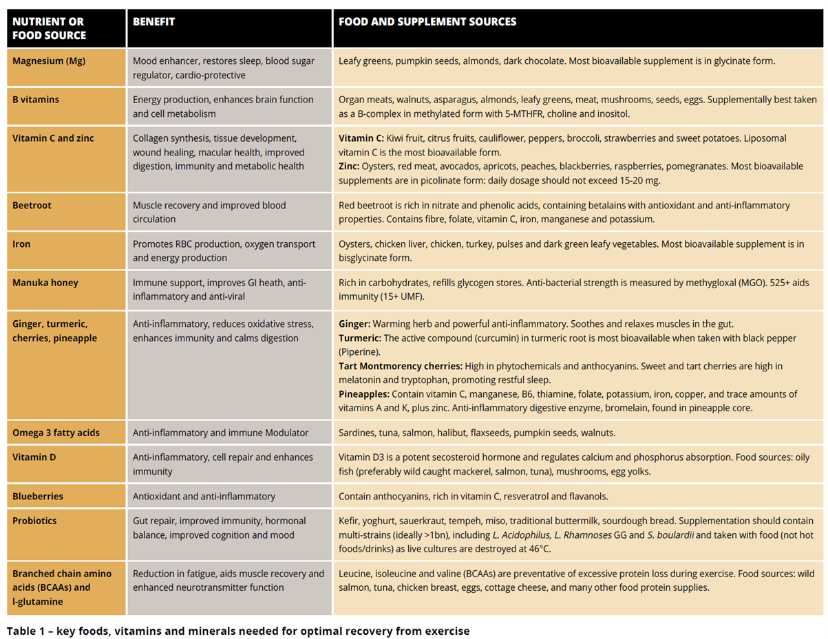 Table 1, summarises key foods, vitamins and minerals I believe are needed for optimal recovery post training and match days: