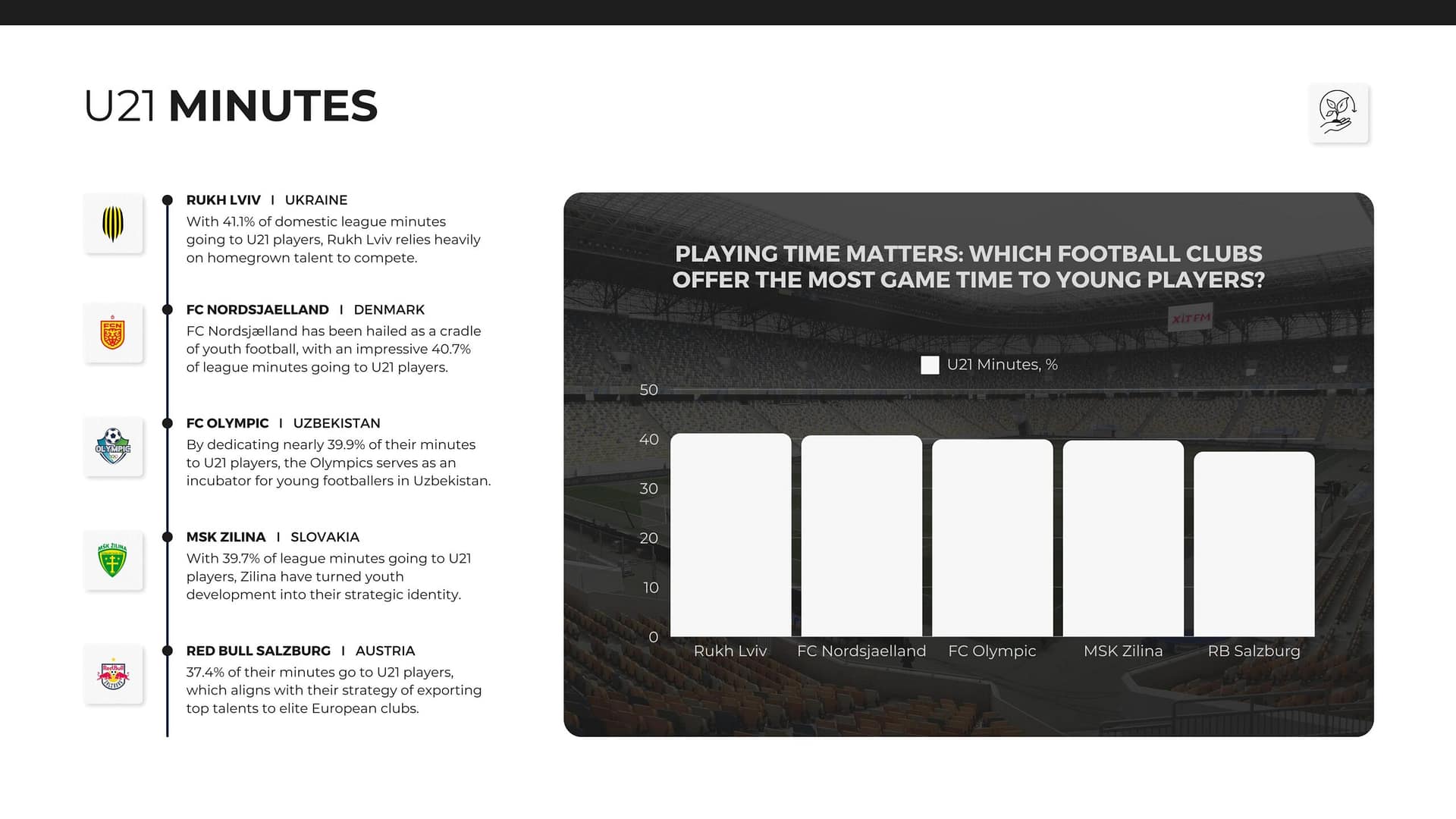 Outside of Europe, FC Olympic from Uzbekistan showcases that youth football is thriving in lesser-known leagues. By dedicating nearly 40% of their minutes to U21 players, the Olympics serves as an incubator for young footballers in Uzbekistan, providing them with the match experience they need to develop at a crucial age. As a result, they stand as a model of how more minor leagues can nurture talent effectively.