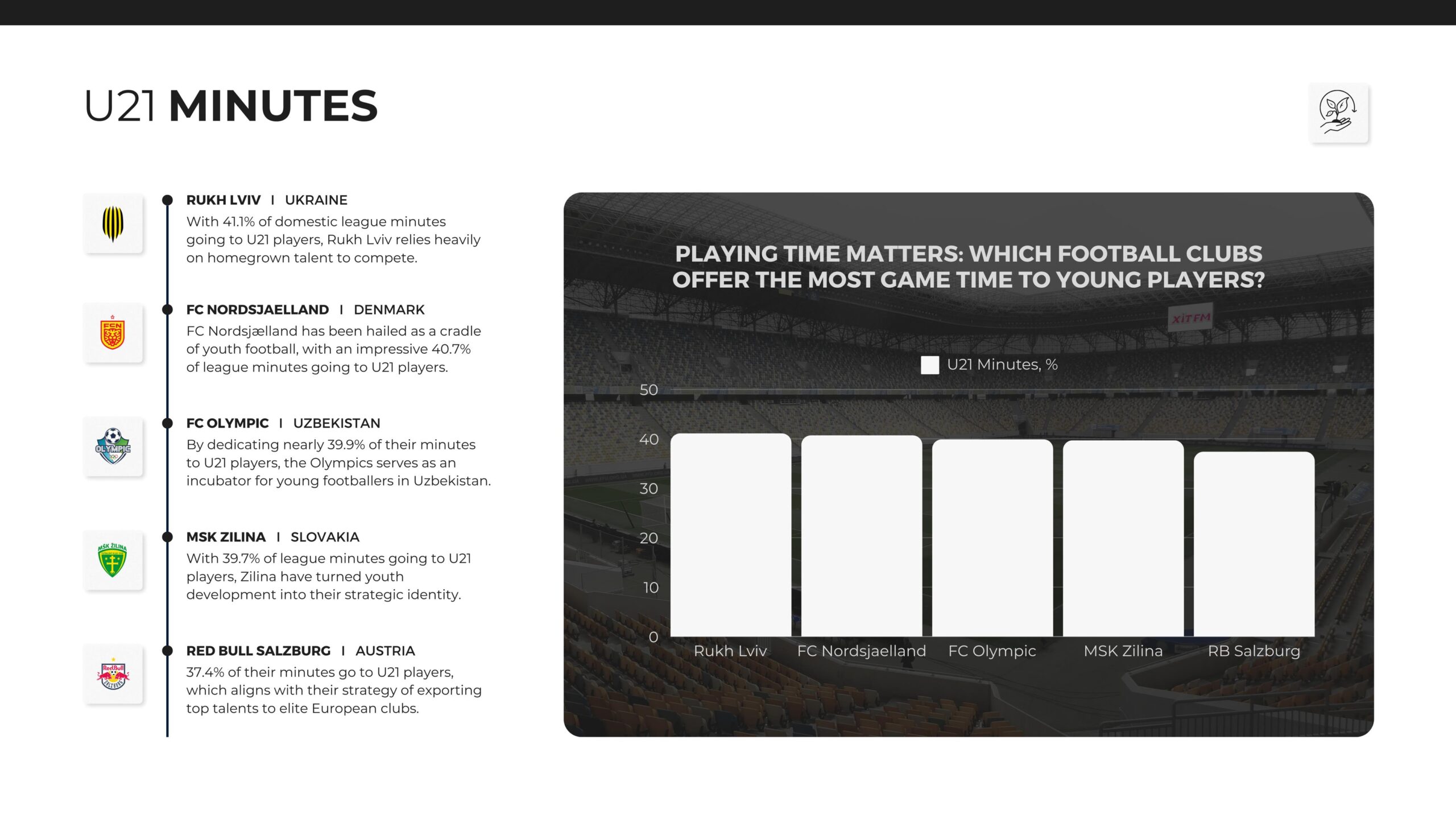 The data spans three years, making it possible to observe consistent trends and deduce whether these clubs have a long-term commitment to youth development or if they’re responding to short-term factors like financial constraints. The top youth-oriented clubs range from global powerhouses like Barcelona to lesser-known teams. One of them is Rukh Lviv, a Ukrainian side that tops the chart globally. 41.1% of their domestic minutes go to U21 players.