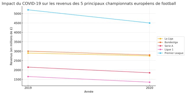 Au cours de la saison 2019/2020, l’impact financier de la pandémie de COVID-19 a durement frappé les principales ligues de football européennes. Selon Deloitte, les revenus de la Premier League ont chuté de 13 %, passant de 5,2 milliards de livres sterling à 4,5 milliards de livres sterling, entraînant d’importantes pertes prévues. La Bundesliga allemande a connu un recul plus modéré de 4 %, pour atteindre 2,8 milliards de livres sterling. En Espagne, les revenus de La Liga ont diminué de 8 %, s’établissant à 2,7 milliards de livres sterling. La France, qui a annulé sa saison en intégralité, a enregistré une baisse de 16 %, à 1,4 milliard de livres sterling. L’Italie, quant à elle, a connu la chute la plus marquée : les revenus de la Serie A ont reculé de 18 %, tombant à 1,8 milliard de livres sterling.