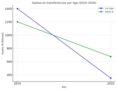 Esta crisis también impactó la ventana de fichajes del verano de 2020, durante la cual los clubes de la Serie A y La Liga redujeron drásticamente sus gastos en el mercado. Según el Observatorio de Fútbol CIES, los gastos de La Liga pasaron de €1.4 mil millones (£1.19 mil millones) en 2019 a €348 millones (£296 millones) en 2020, mientras que los de la Serie A disminuyeron de €1.2 mil millones (£1.02 mil millones) en 2019 a €667 millones (£567 millones) en 2020.