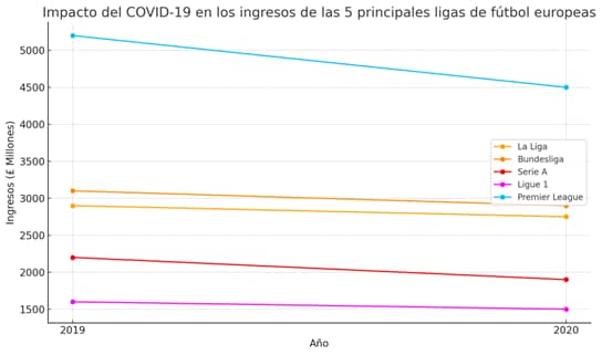 Durante la temporada 2019/20, el impacto financiero de la COVID-19 afectó gravemente a las principales ligas de fútbol de Europa. Según Deloitte, los ingresos de la Premier League cayeron un 13 %, pasando de £5.2 mil millones a £4.5 mil millones, lo que generó pérdidas significativas. La Bundesliga alemana experimentó una disminución más moderada del 4 %, bajando a £2.8 mil millones. En España, los ingresos de La Liga disminuyeron un 8 %, situándose en £2.7 mil millones. Francia, que canceló completamente su temporada, registró una caída del 16 %, hasta £1.4 mil millones. Mientras tanto, la Serie A de Italia sufrió la mayor caída, con una reducción del 18 % en sus ingresos, hasta £1.8 mil millones.